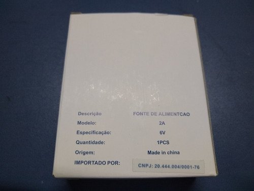 FONTE ALIMENTAÇÃO BIVOLT 6V 2A A Fonte adaptador ZX-0602 possui entrada Bivolt e saída 6V 2A, plug P4 de 2,1mm e cabo de 90cm. Características Marca: ZX IMPORTADO Modelo: ZX-0602 Entrada: 100-240VAC 50/60 Hz Saída: 6V 2A Tipo de pino: P4 (2,1mm) Garantia de 90 dias contra defeito de fabricação Dimensões (cm): A 6,7 X L 2,6 X C 7,6 Comprimento cabo: 90cm Peso: 66g Atenção: Verifique antes da compra se sua antiga fonte tem a mesma pinagem.